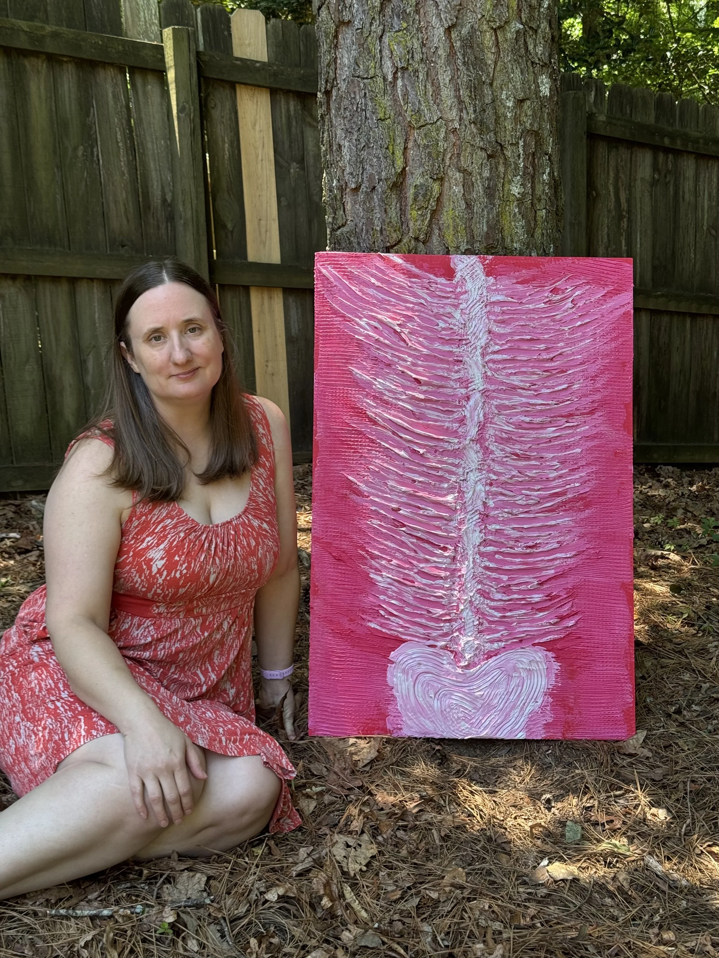 Karin Schneider is a multimedia artist based in Raleigh, North Carolina. Her work transforms lived experiences of disability, chronic pain, and mental illness into textured, dimensional paintings that weave together words, materials, and meaning. Across two decades and multiple media, her practice has remained centered on giving form to what is difficult to articulate and inviting viewers to find their own reflection within it.